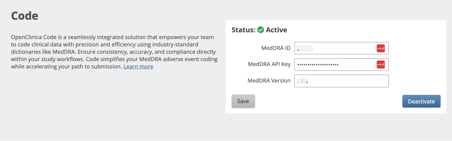 - MedDRA ID, MedDRA API Key, and MedDRA Version.