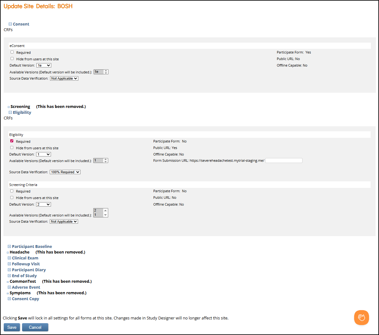 - If a new form is created after site settings are saved, the form will automatically inherit its configuration and any subsequent settings changes from Study Designer.