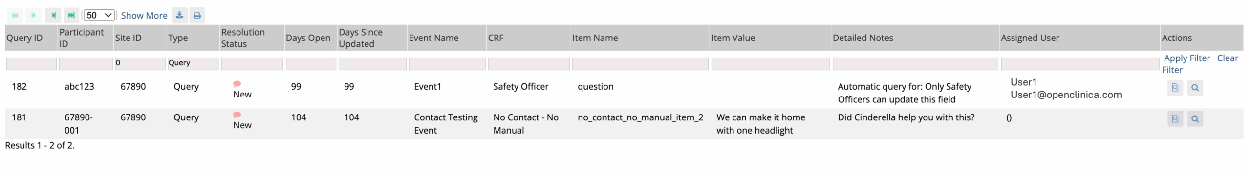 ℹ️ Note: Queries created or closed automatically by OpenClinica (for example, when you leave a form, remove a form or event, publish a form version, or run an import) are attributed to the System user in the Queries table. This distinguishes them from queries added manually by users.